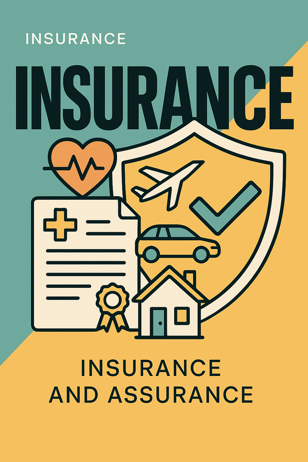 /Collection: /by davooda/Type: PNG/A modern vector illustration featuring insurance-related icons such as a heart monitor, airplane, and house, complemented by bold typography. The layout uses dynamic color blocks for a stylish look.