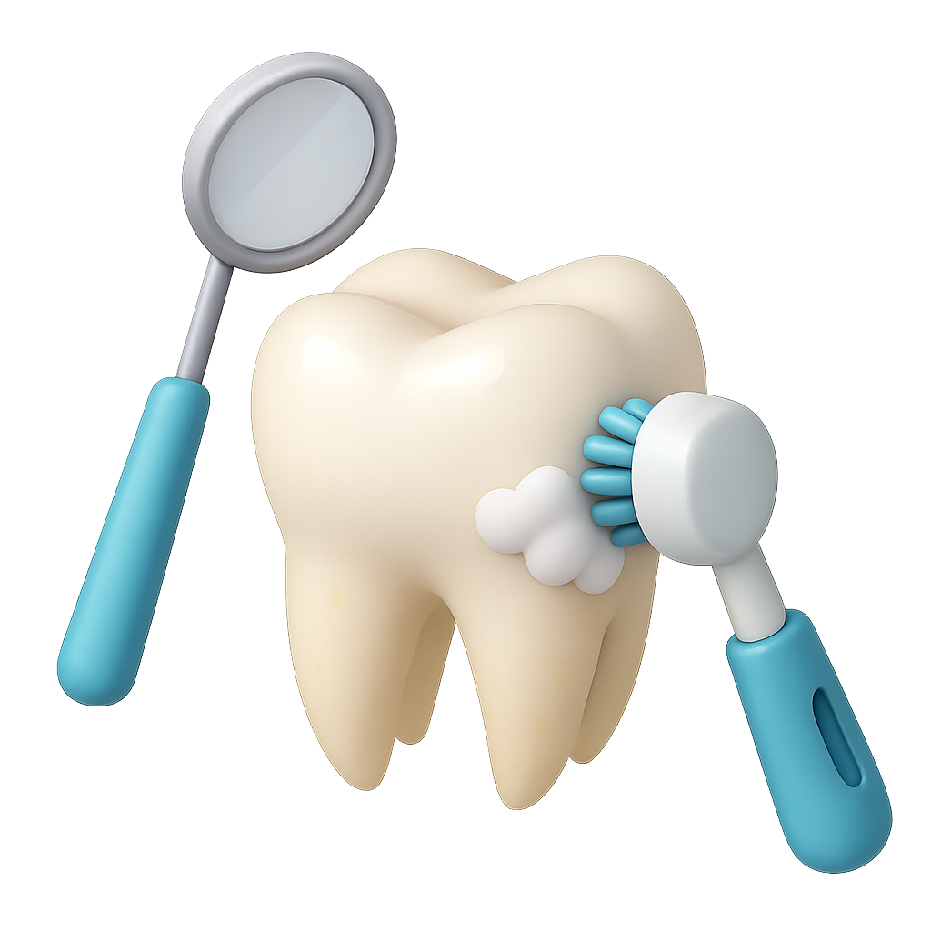 A stylized 3D icon featuring a tooth being cleaned with a dental tool and mirror. The design conveys a professional dental cleaning scene in a volumetric style.