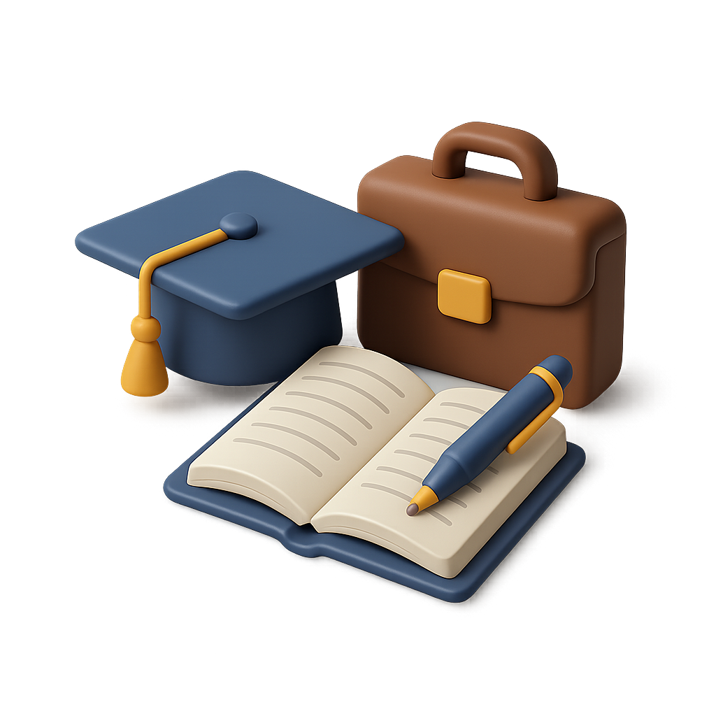 /Collection: /by davooda/Type: PNG/A stylized 3D icon depicting a graduation cap, an open book, a pen, and a briefcase. The design features a transparent background with a three-quarter isometric perspective, emphasizing a volumetric appearance.