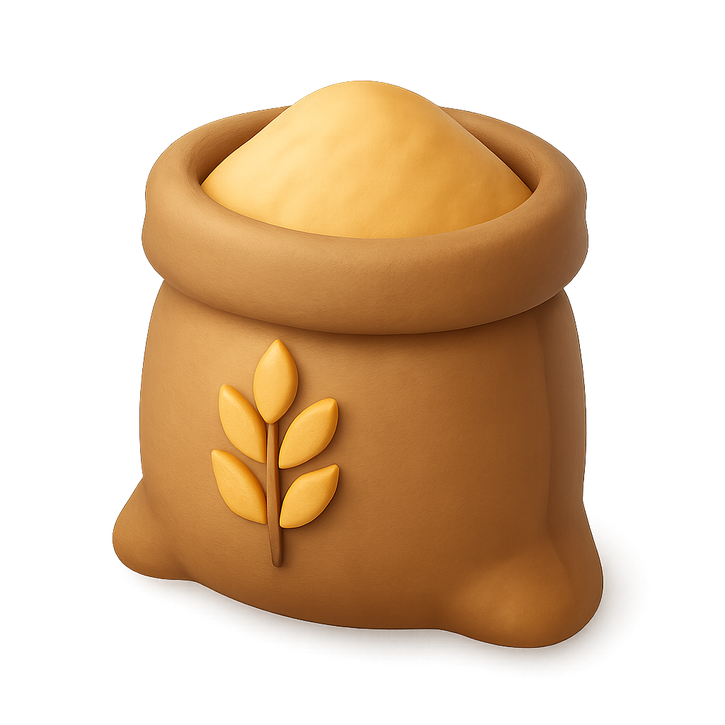 /Collection: /by davooda/Type: PNG/A stylized 3D icon of a wheat sack filled with flour, presented in a three-quarter isometric view. The sack features a decorative wheat design, emphasizing a volumetric appearance with a transparent background.