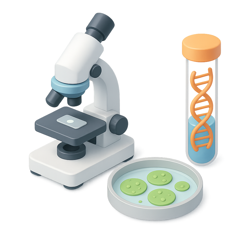 A visually appealing 3D icon depicting a microscope, a petri dish with green cells, and a test tube containing a DNA strand. The design features a transparent background and a three-quarter isometric view.