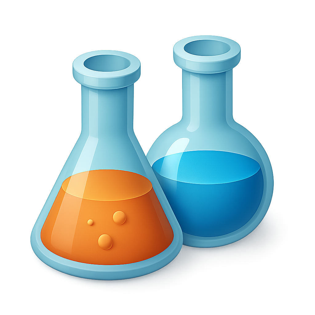 /Collection: /by davooda/Type: PNG/This image features two 3D laboratory flasks in vibrant colors. One flask contains orange liquid with bubbles, while the other holds blue liquid, all set against a soft gradient background.