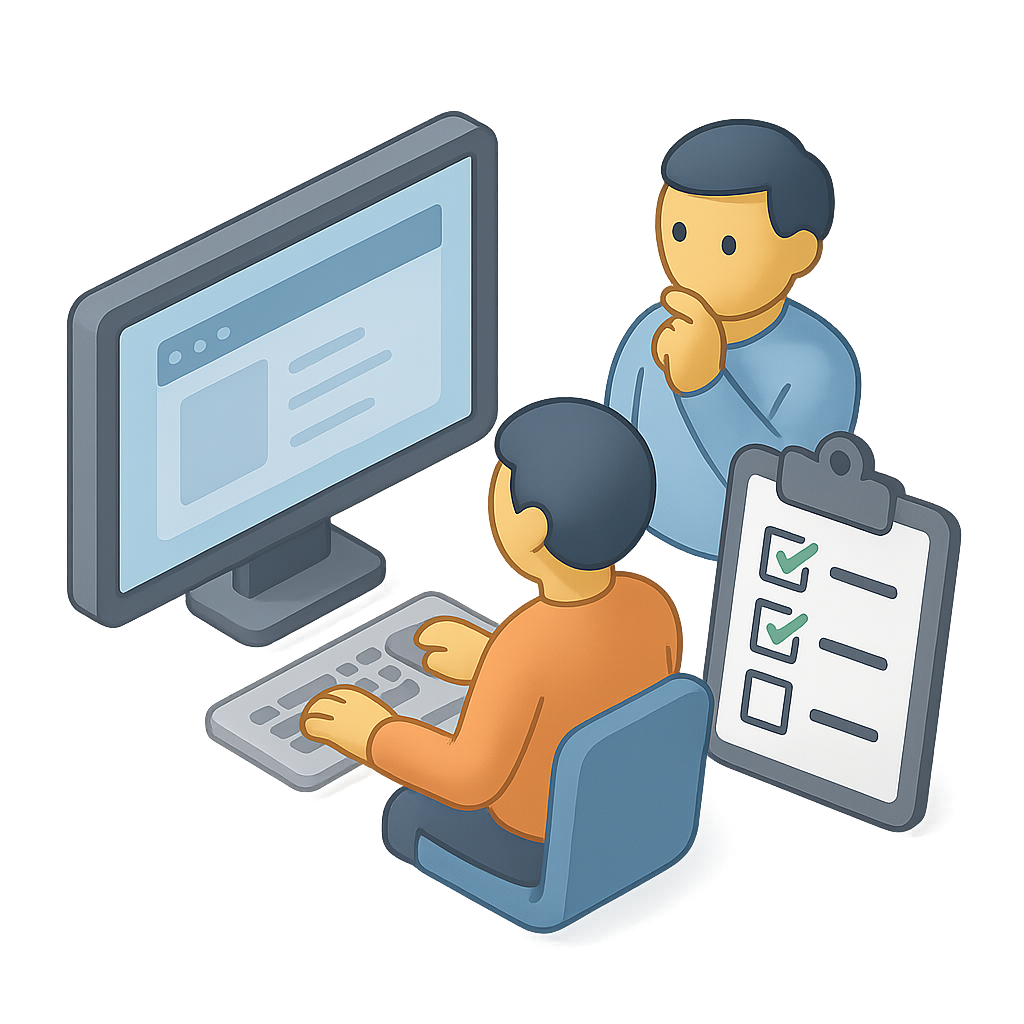 An isometric 3D illustration depicting a user engaging in usability testing. It features a person at a computer, contemplating, alongside a checklist and another figure, enhancing the usability theme.