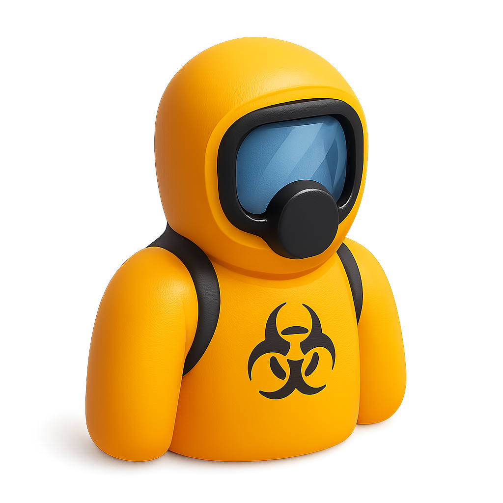 /Collection: /by davooda/Type: PNG/A stylized 3D icon of a hazmat suit in yellow, featuring a biohazard symbol. The figure has a transparent visor and a rounded, cartoonish design, set against a gradient background.