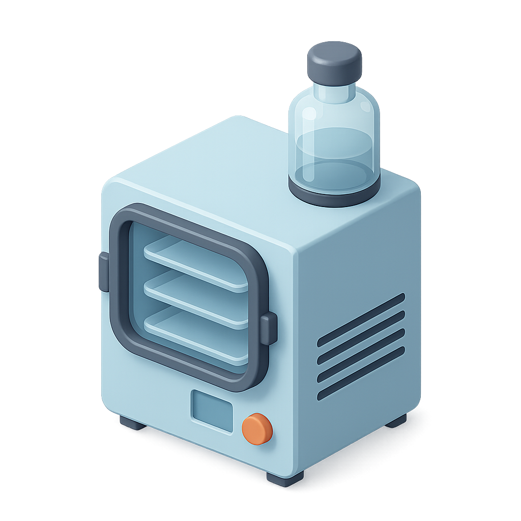 A 3D isometric icon of a freeze dryer, featuring a compact design with a transparent container on top. The appliance is rendered in soft colors, emphasizing its volumetric structure.