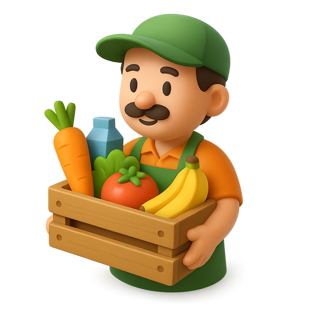 A whimsical 3D icon of a grocer holding a crate filled with fresh groceries, including vegetables and fruits. The character is designed in an isometric style with a vibrant color palette.