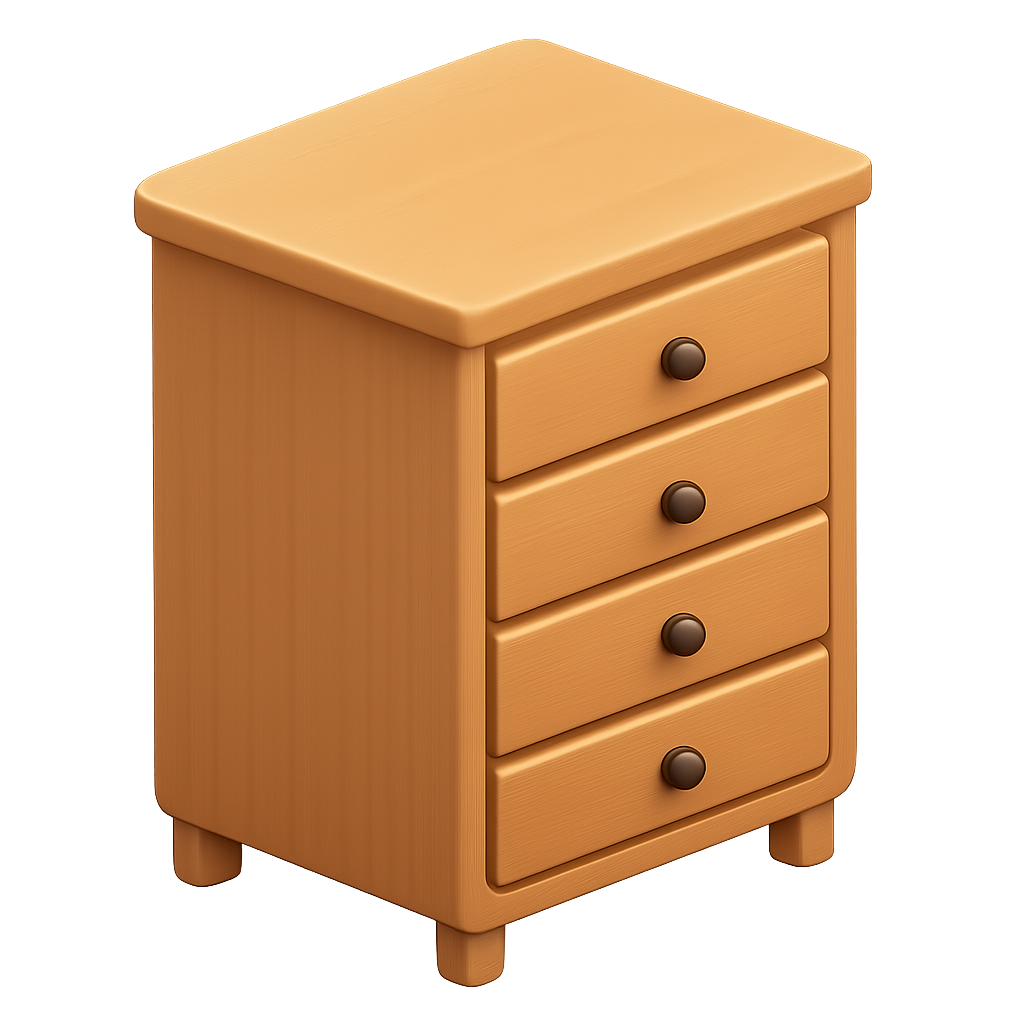 A sleek 3D icon of a wooden dresser featuring four drawers, presented in an isometric view with a soft, volumetric design on a transparent background.