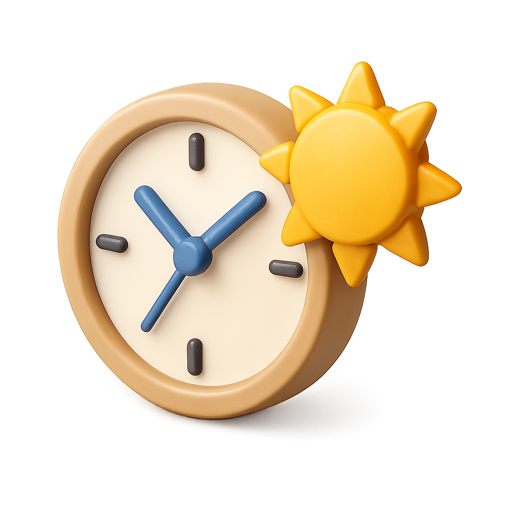 A stylized 3D clock featuring a sun motif. The clock has a beige base, blue hands, and a bright yellow sun on top, set against a soft gradient background.