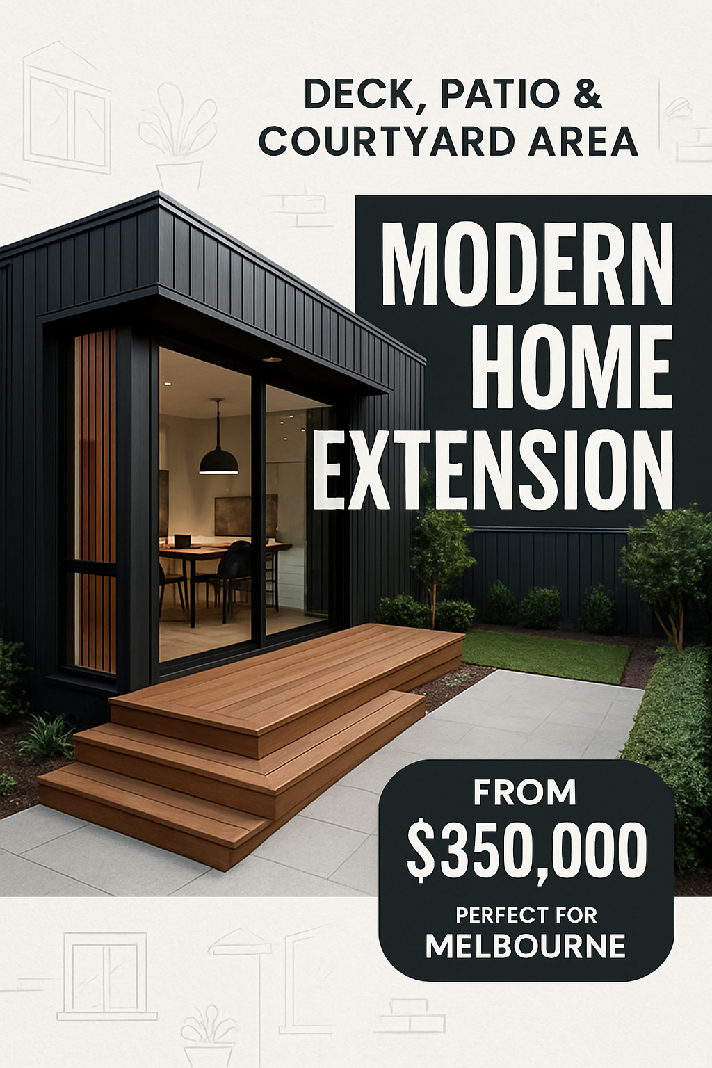 /Collection: /by davooda/Type: PNG/A sleek advertisement showcasing a modern home extension in Melbourne, featuring a deck, patio, and courtyard. The design balances realism and simplicity against a light textured background.