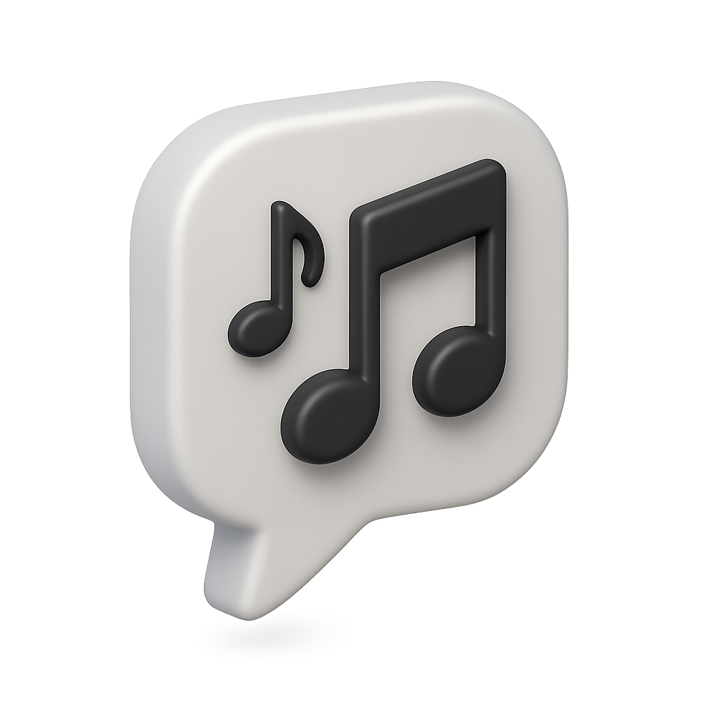 A 3D icon featuring a white speech bubble with black music notes, designed in a three-quarter isometric view against a subtle gradient background.