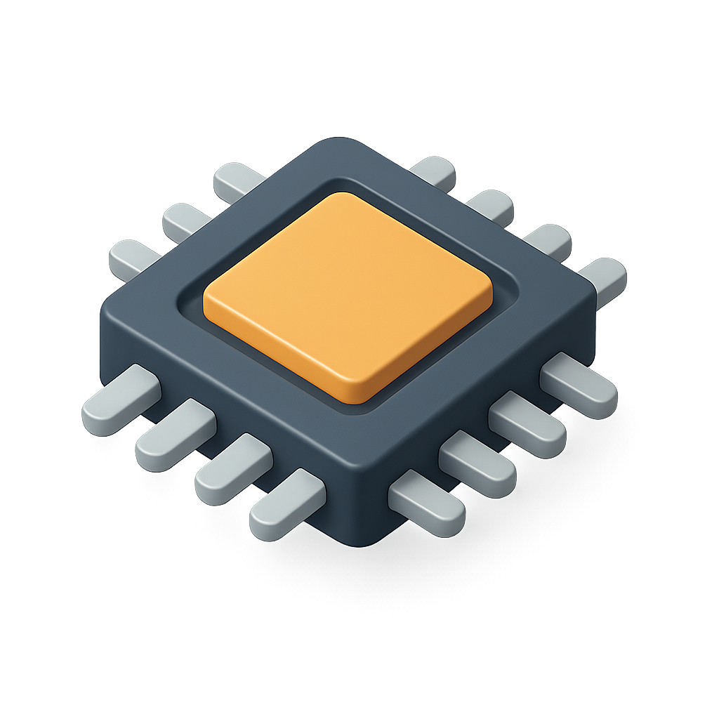 A detailed 3D illustration of a microchip featuring a central yellow square and multiple metallic pins. The design is isometric with a volumetric feel and a transparent background.