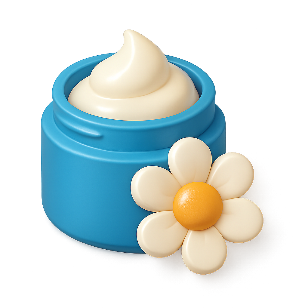 This image features a blue container filled with cream, accompanied by a cheerful flower. The design is 3D, offering a volumetric and isometric perspective with a transparent background.