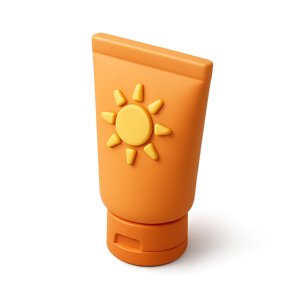 This image features a stylized 3D icon of a sunscreen lotion tube. The tube is orange with a sun emblem, rendered in a three-quarter view with a volumetric design on a transparent background.