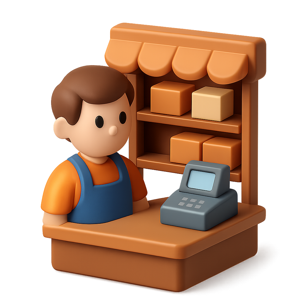 A stylized 3D icon of a shopkeeper behind a counter, featuring shelves with boxes. The character has a friendly expression and wears an apron, all in a vibrant, isometric design.