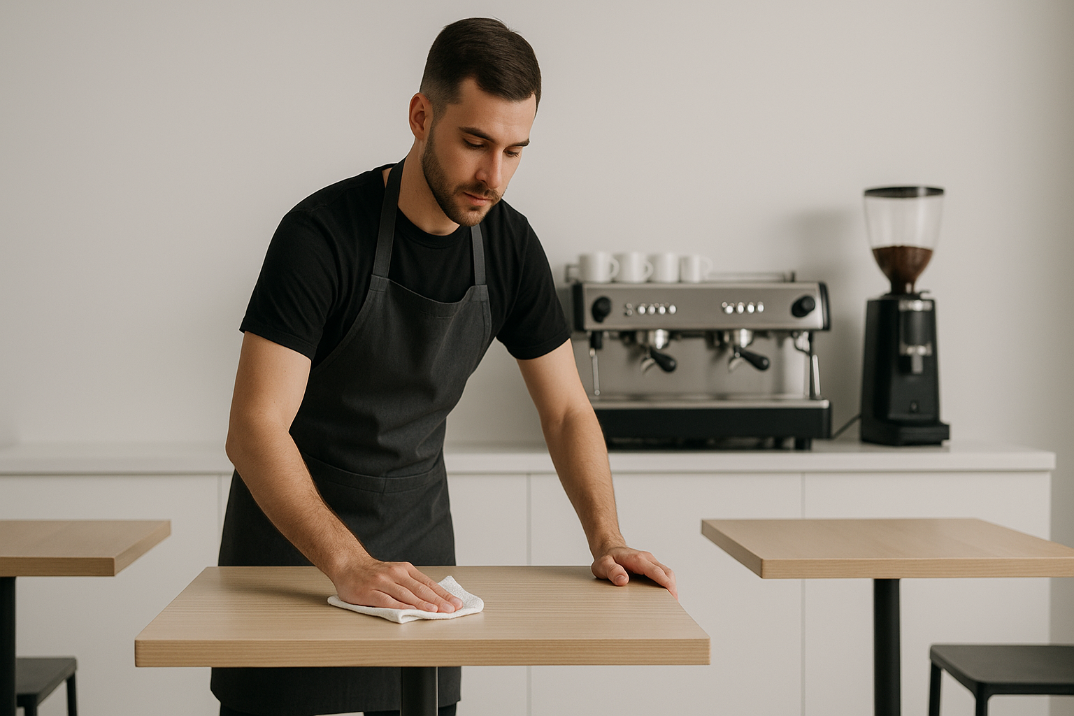 A focused barista wipes down a wooden table in a modern, minimalist café. The setting features sleek furniture and a stylish coffee machine in the background.