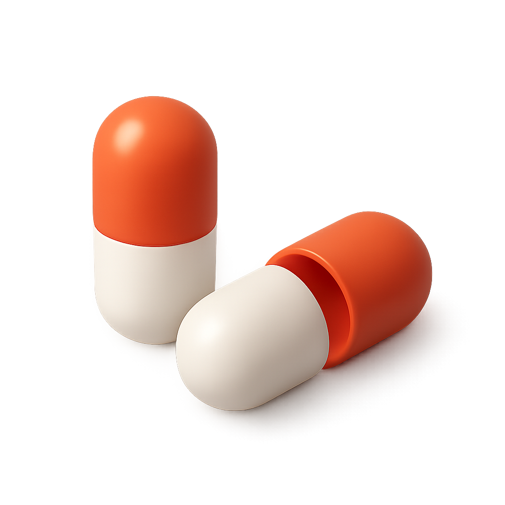 A visually striking 3D representation of two capsules, one open and one closed, featuring a vibrant orange and white color scheme, set against a soft gradient background.