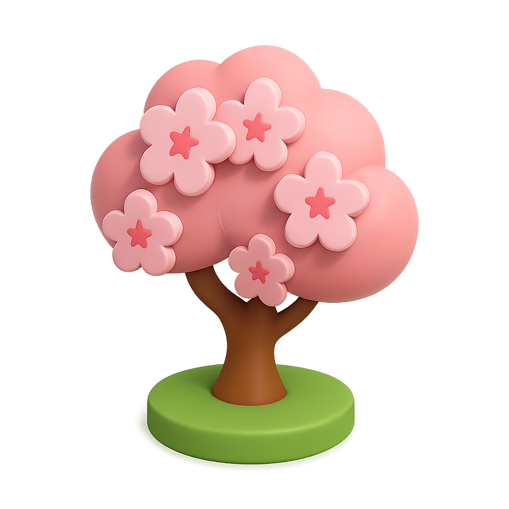 A stylized 3D icon of a cherry blossom tree in a three-quarter view. The tree features pink blossoms with star-shaped centers, set against a soft gradient background.