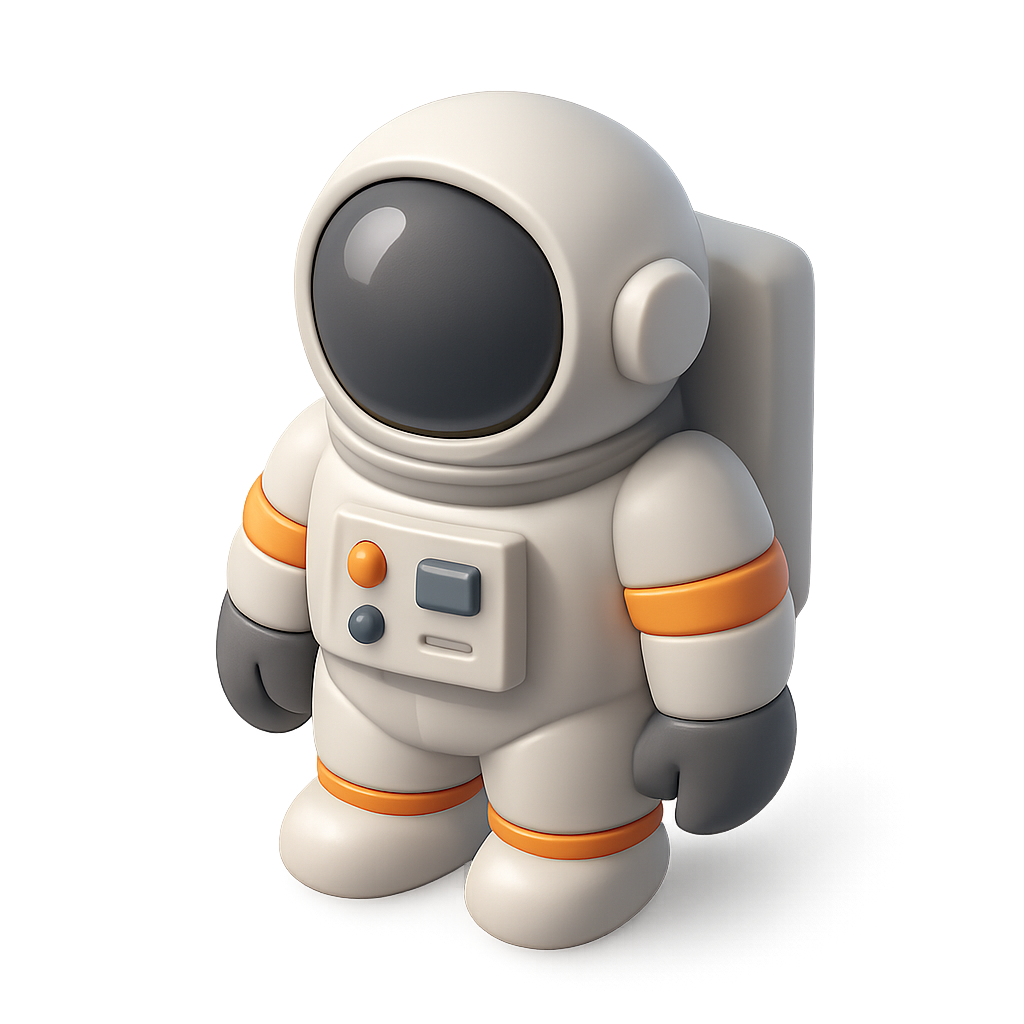 A stylized 3D astronaut icon featuring a spacesuit design with a transparent background. The icon showcases a three-quarter view, emphasizing its volumetric and isometric qualities.