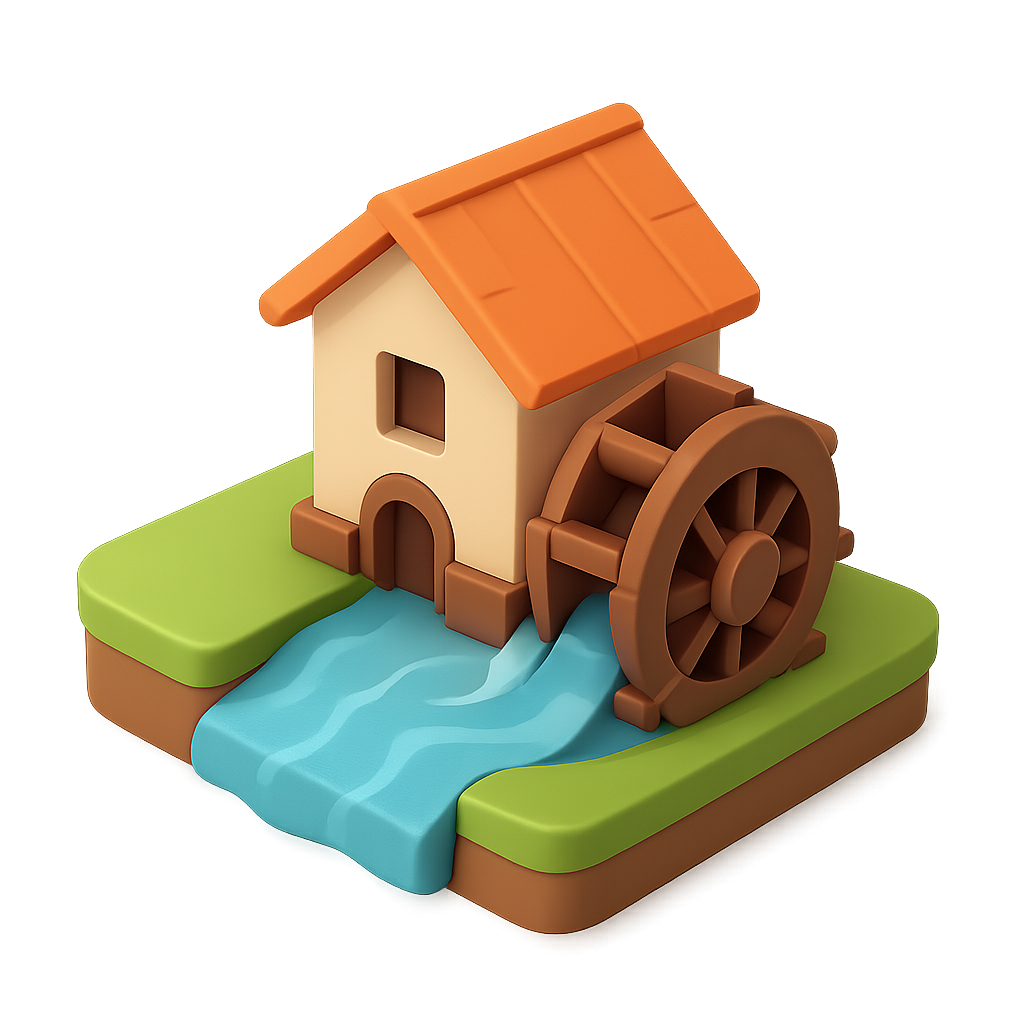 A delightful 3D icon featuring a quaint watermill with a wooden water wheel, set against a flowing river. The scene has a vibrant, isometric design with a transparent background.