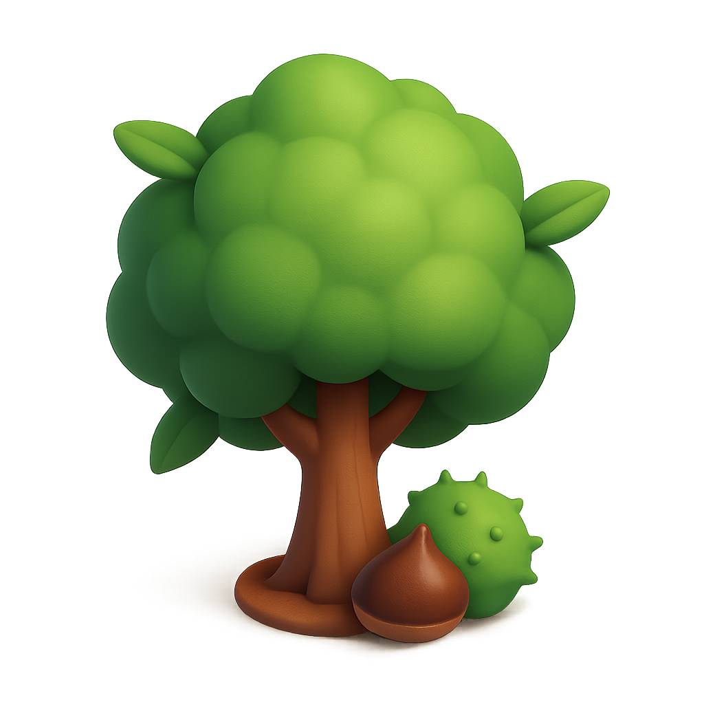 A vibrant 3D icon of a chestnut tree featuring lush green leaves and a brown trunk, with a chestnut nut and its spiky casing at the base, set against a soft gradient background.