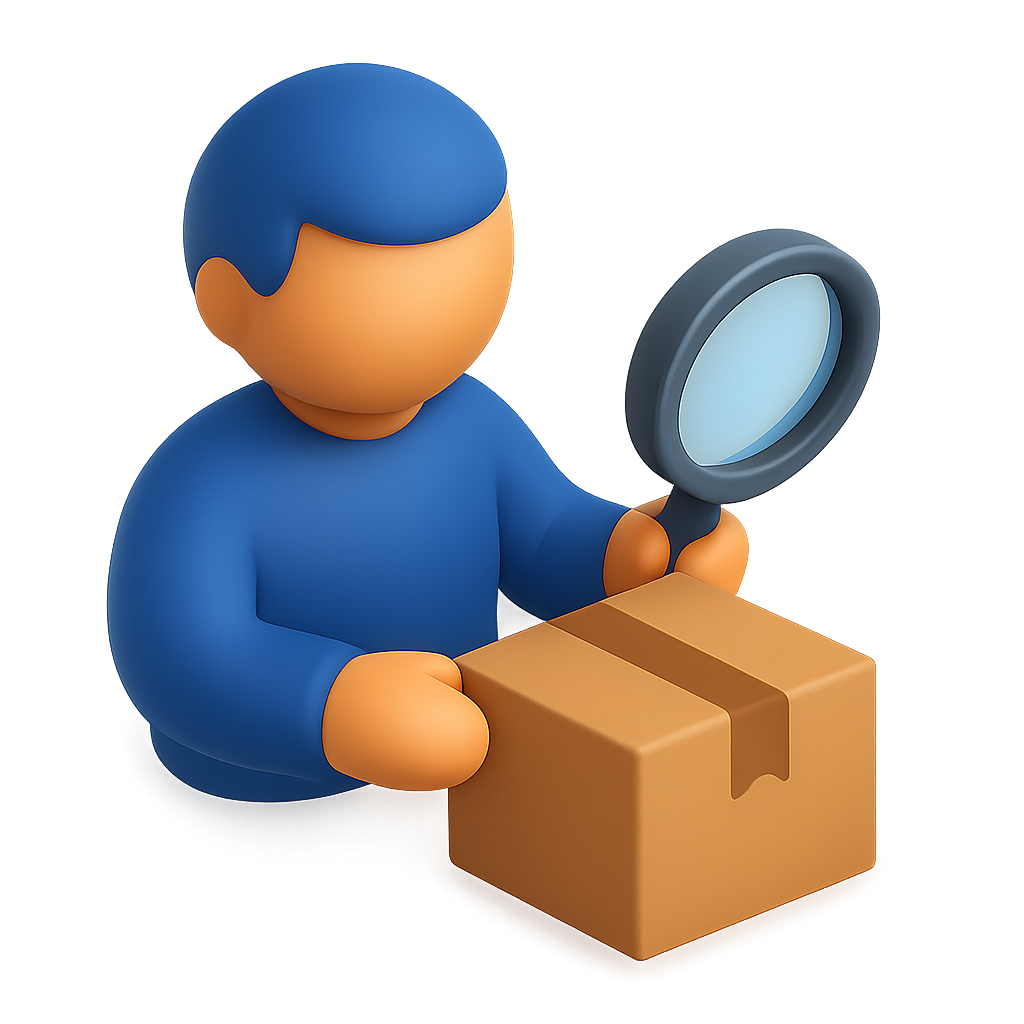 A 3D styled icon depicting a person examining a brown package with a magnifying glass, showcasing a three-quarter isometric view on a transparent background.
