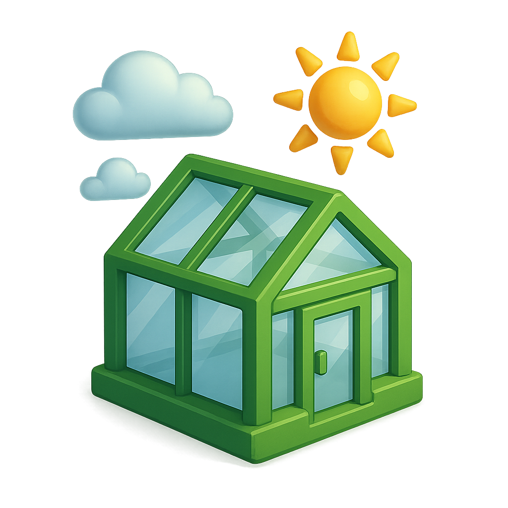 3D Greenhouse Icon with Sun and Clouds in Isometric View
