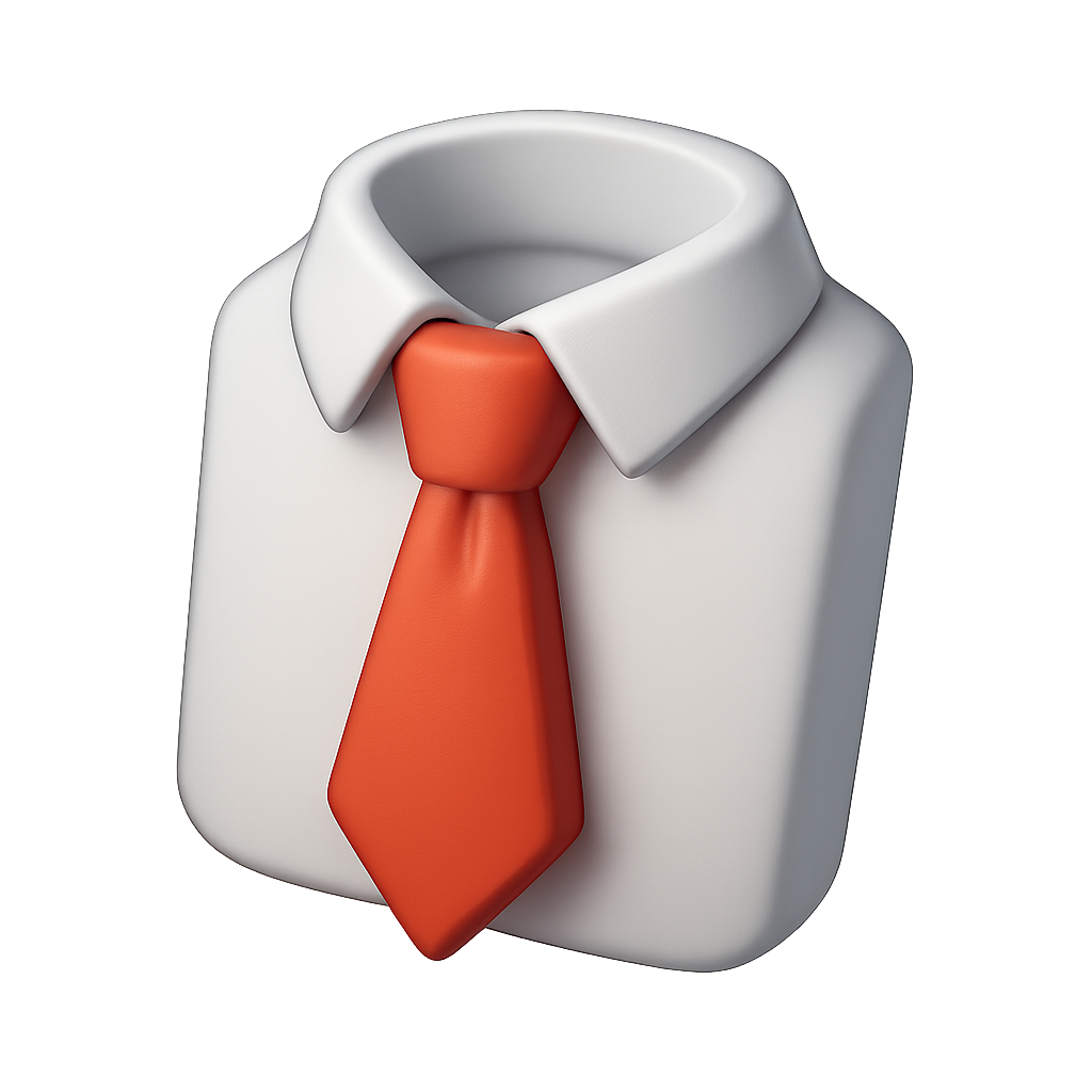 A visually striking 3D icon depicting a necktie and collar in a three-quarter isometric view. The vibrant orange tie contrasts with a clean white shirt background, enhancing its formal appeal.