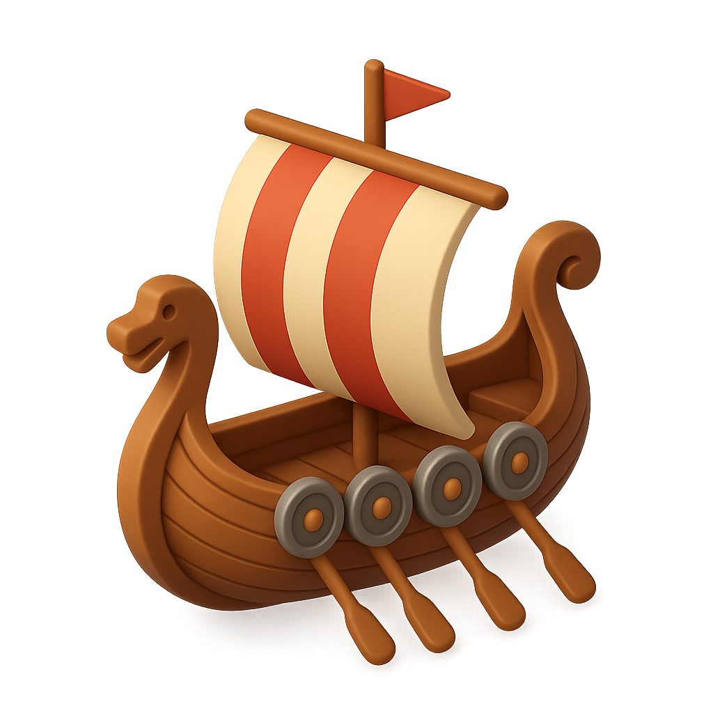 A stylized 3D icon of a Viking longship featuring a dragon head, a striped sail, and oars. The design has a smooth, volumetric look with a transparent background.