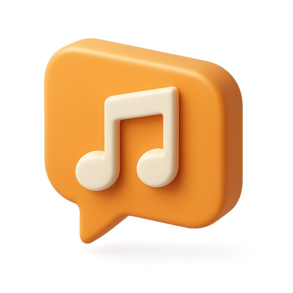 A 3D icon featuring a speech bubble with music notes inside. The design has a vibrant orange color, with a smooth, glossy finish, set against a soft gradient background.