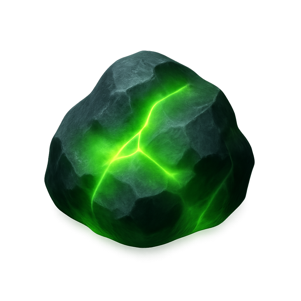 A visually striking 3D icon of uranium ore, featuring a glowing green hue and a textured rocky surface. The isometric view highlights its unique shape and luminous cracks.