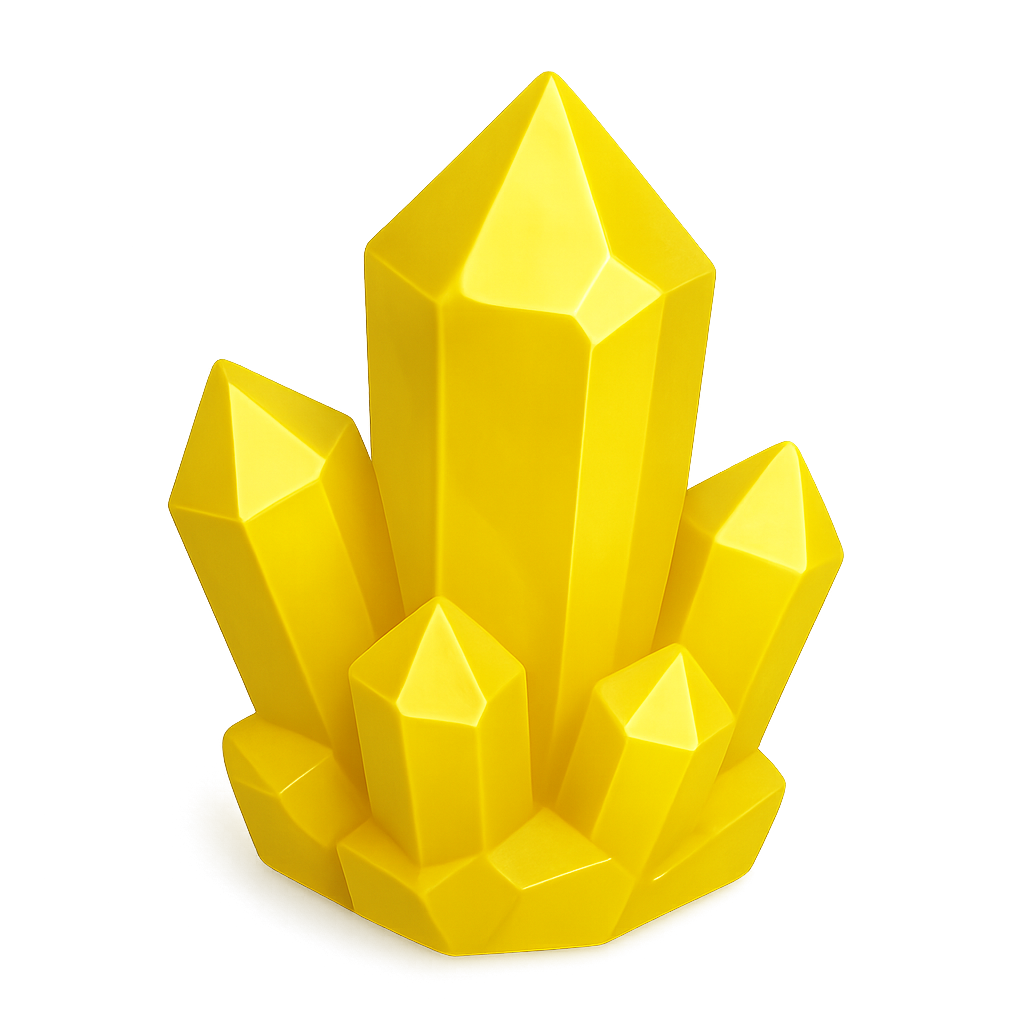 A shiny sulfur yellow crystal formation with multiple pointed facets. The icon is designed in 3D with a transparent background, showcasing a three-quarter view and an isometric perspective.