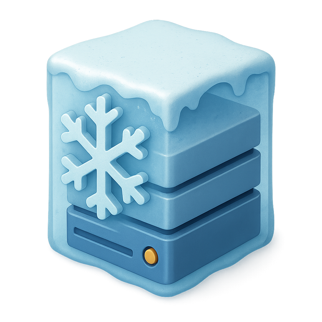 A 3D icon representing frozen storage, featuring a snowflake design on a blue data server encased in ice. The icon has a transparent background and a volumetric, isometric appearance.