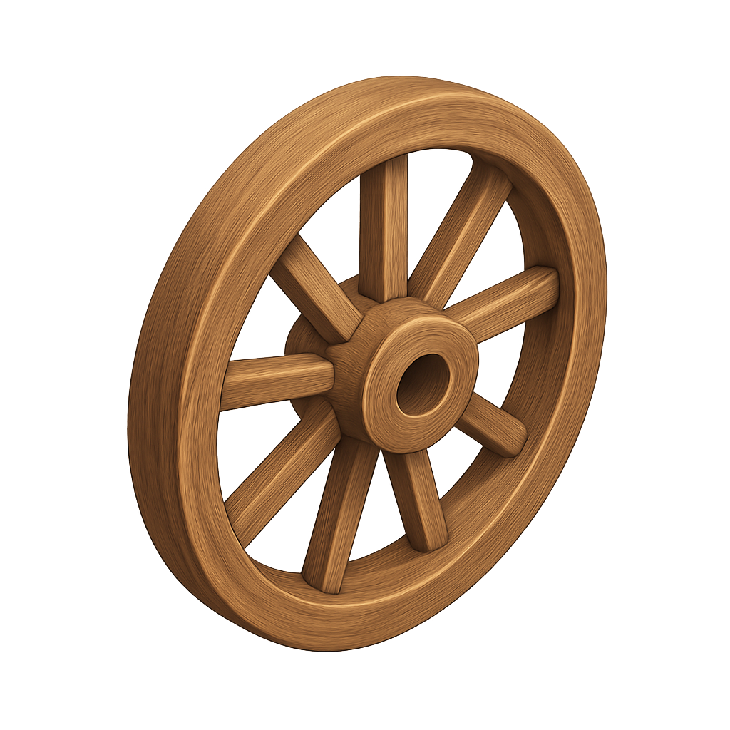 This image features a 3D rendered icon of an ancient wooden wheel, presented in a three-quarter isometric view. The wheel showcases detailed wood texture and design elements.