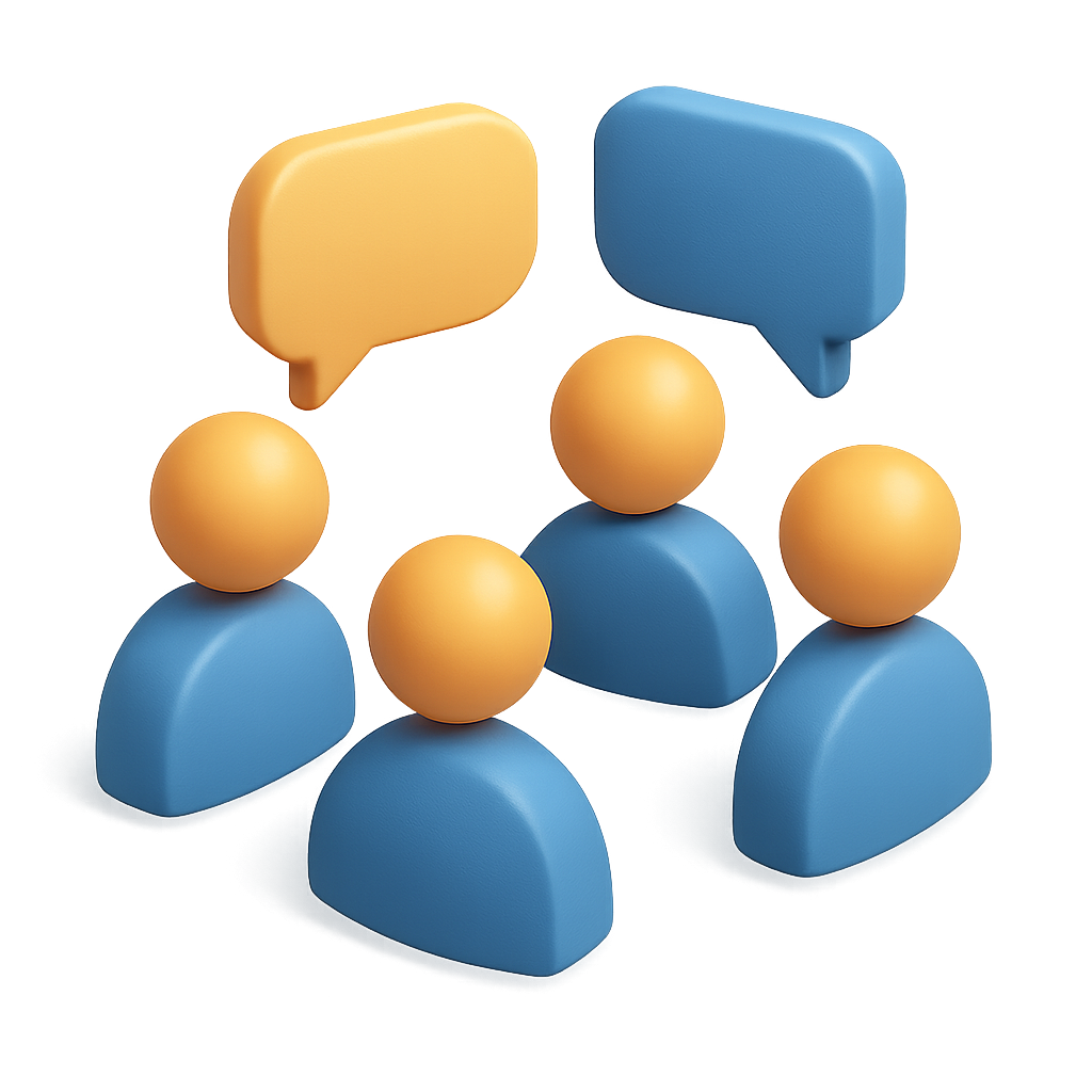 A visually appealing 3D icon featuring stylized figures in vibrant blue and orange colors, with speech bubbles representing communication. The design offers a modern, isometric view suitable for discussions.