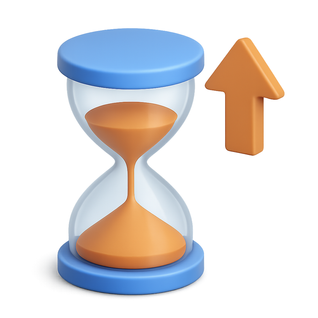 /Collection: /by davooda/Type: PNG/A sleek 3D icon featuring an hourglass with a transparent body and an orange sand core, accompanied by a vibrant upward arrow, all set against a smooth gradient background.