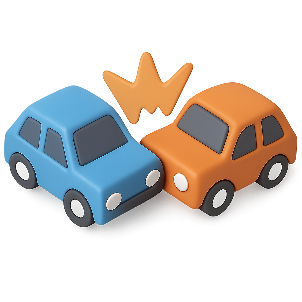A vibrant 3D icon depicting two cartoon-style cars colliding. The blue and orange cars feature rounded shapes and a playful design, set against a gradient background.