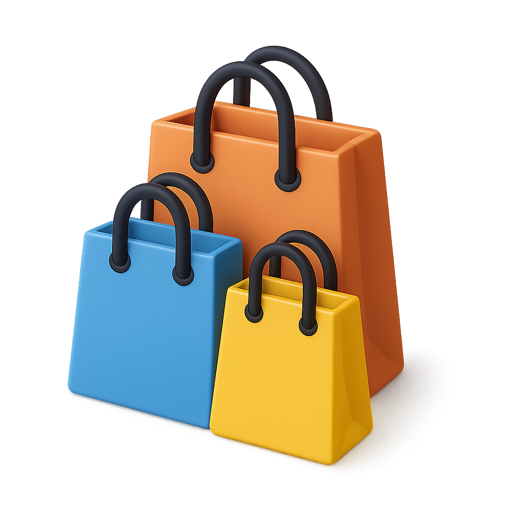 An isometric view of three shopping bags in vibrant colors, stacked together. The bags have a 3D effect with a transparent background, showcasing their volumetric design.