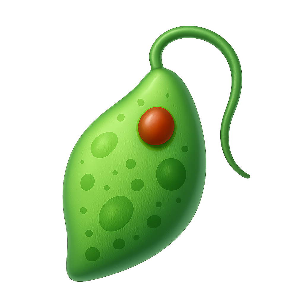 A vibrant 3D representation of a euglena, showcasing its green cell body with a red nucleus. The design features a three-quarter view with a smooth, glossy appearance and a transparent background.