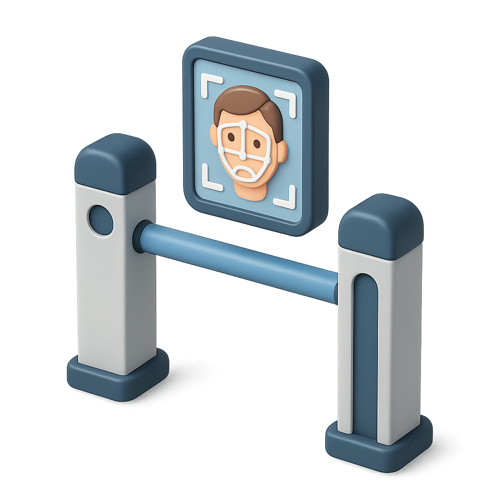 A 3D representation of a facial recognition gate icon featuring a stylized face within a square frame, set against a transparent background with a modern design.