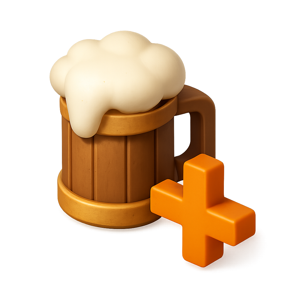A visually striking 3D icon of a beer mug with frothy foam and an orange plus sign, set against a soft gradient background, showcasing an isometric design.