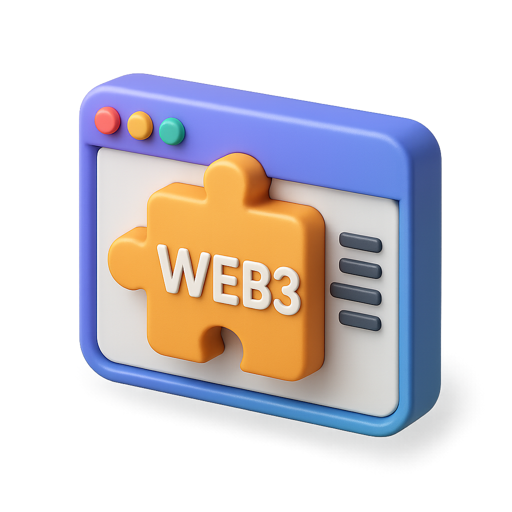 A vibrant 3D icon representing a Web3 browser extension, featuring a puzzle piece symbol in orange on a blue browser window background, designed with an isometric view.
