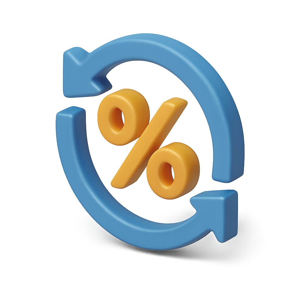 /Collection: /by davooda/Type: PNG/A vibrant 3D percentage icon featuring circular arrows, designed with a blue and orange color scheme. The icon presents a volumetric effect, enhancing its isometric appearance.