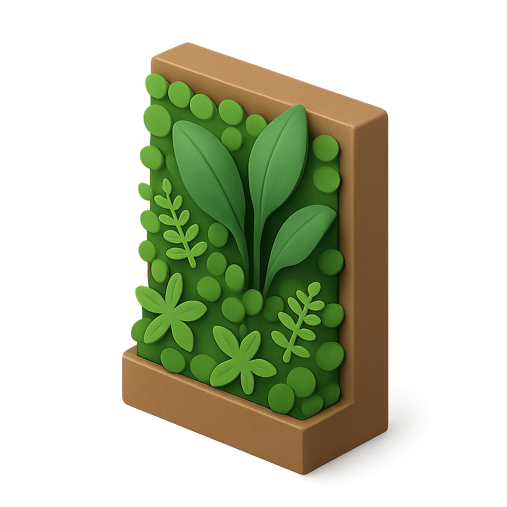 A visually appealing 3D icon of a living wall, featuring various green plants and foliage in a simple, isometric design. The vibrant greens contrast against a textured background.