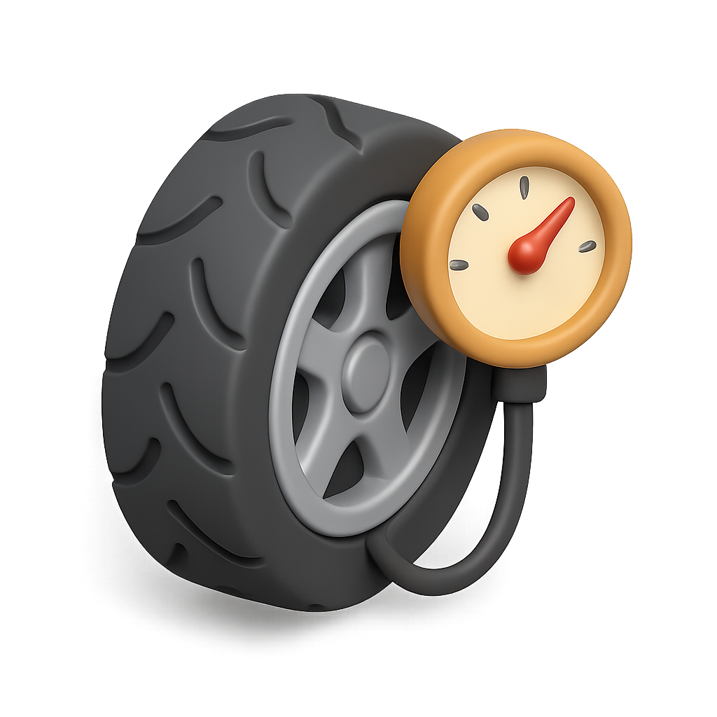 A stylized 3D representation of a tire alongside an air gauge, featuring a transparent background and a three-quarter perspective for a volumetric effect.