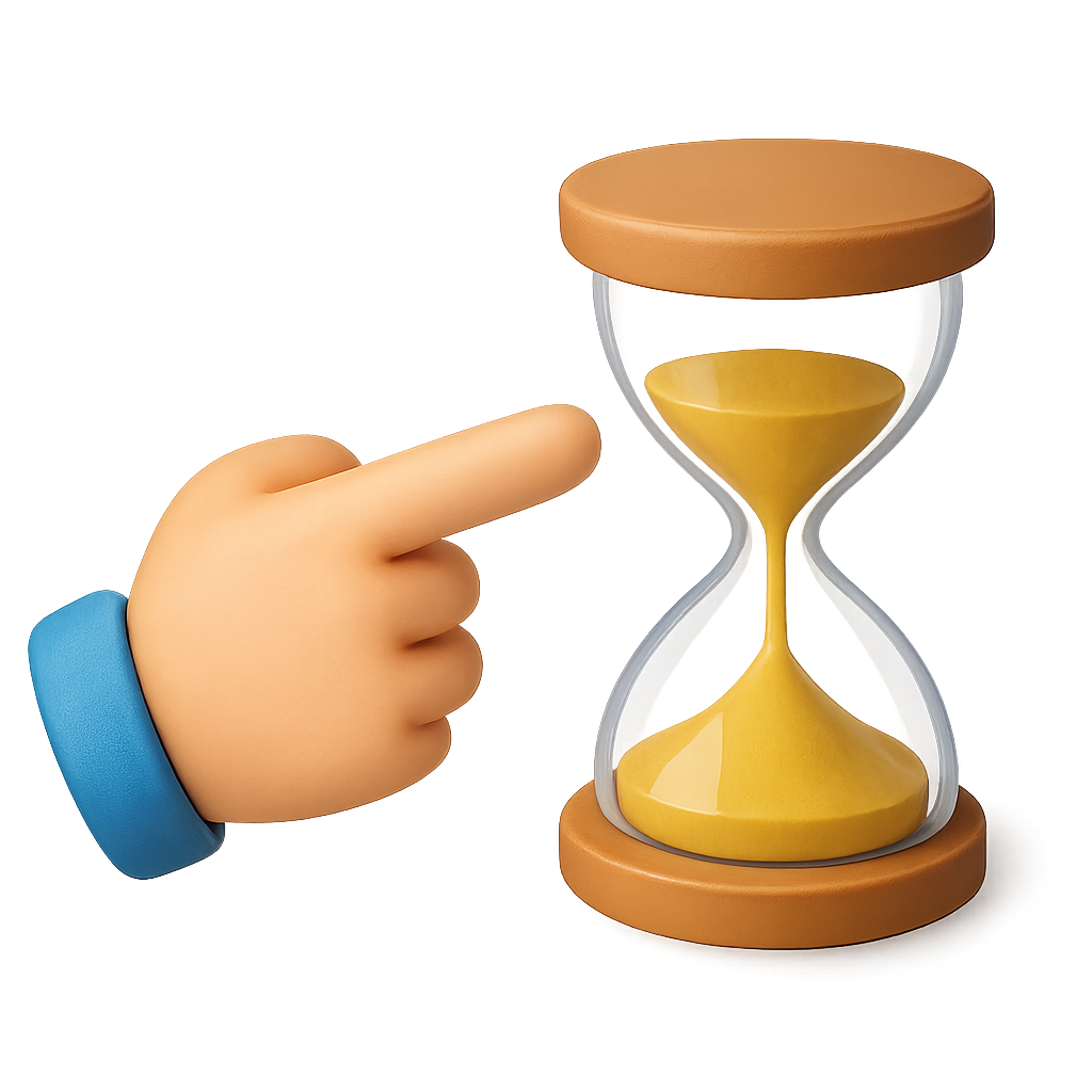 A 3D representation of a hand pointing at a stylized hourglass. The hourglass features a transparent design with yellow sand, set against a soft gradient background.