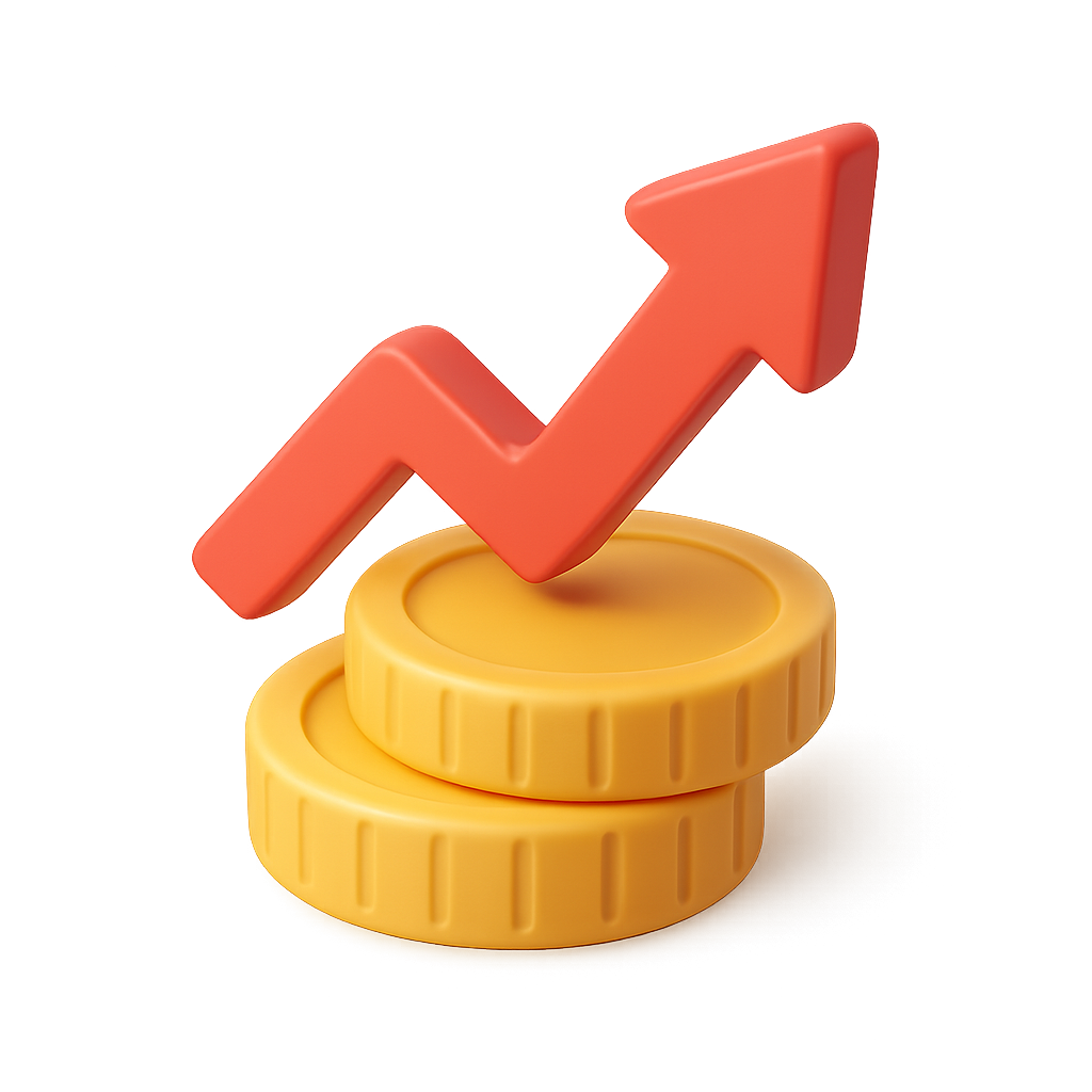 This image features two golden coins stacked on top of each other, accompanied by a red upward arrow. The design has a 3D effect and a transparent background, emphasizing the theme of financial growth.