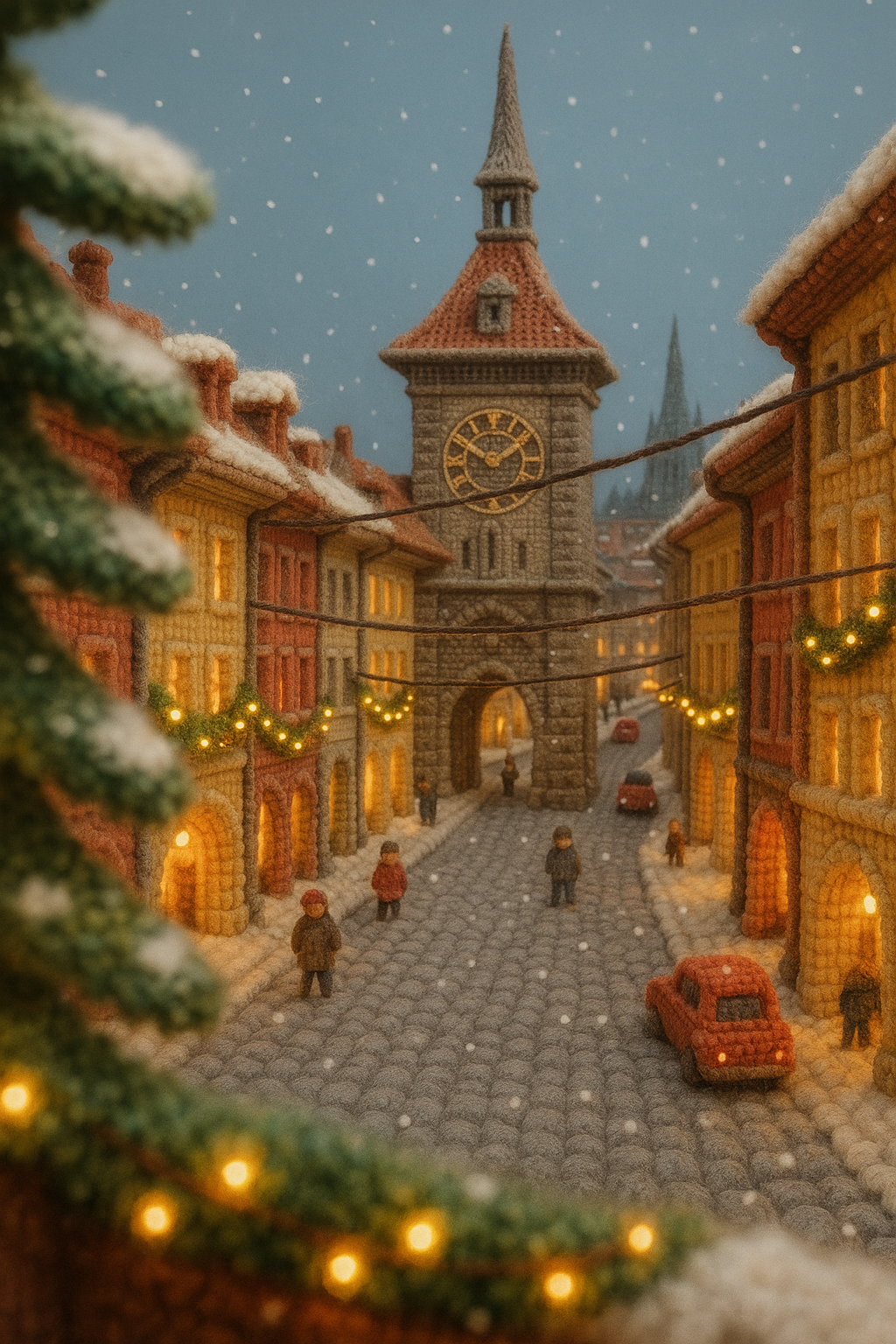 Festive Night in Bern's Old Town Captured in Yarn Art