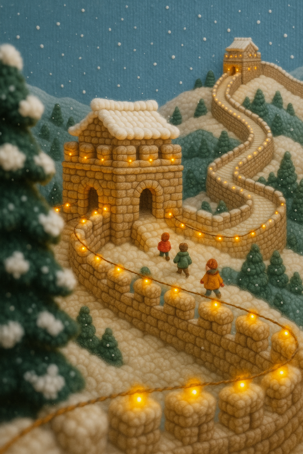/Collection: /by davooda/Type: PNG/A charming 3D depiction of the Great Wall of China crafted from thick yarn-like textures, featuring a snowy landscape and small figures. Warm lights adorn the wall, adding to the festive atmosphere.