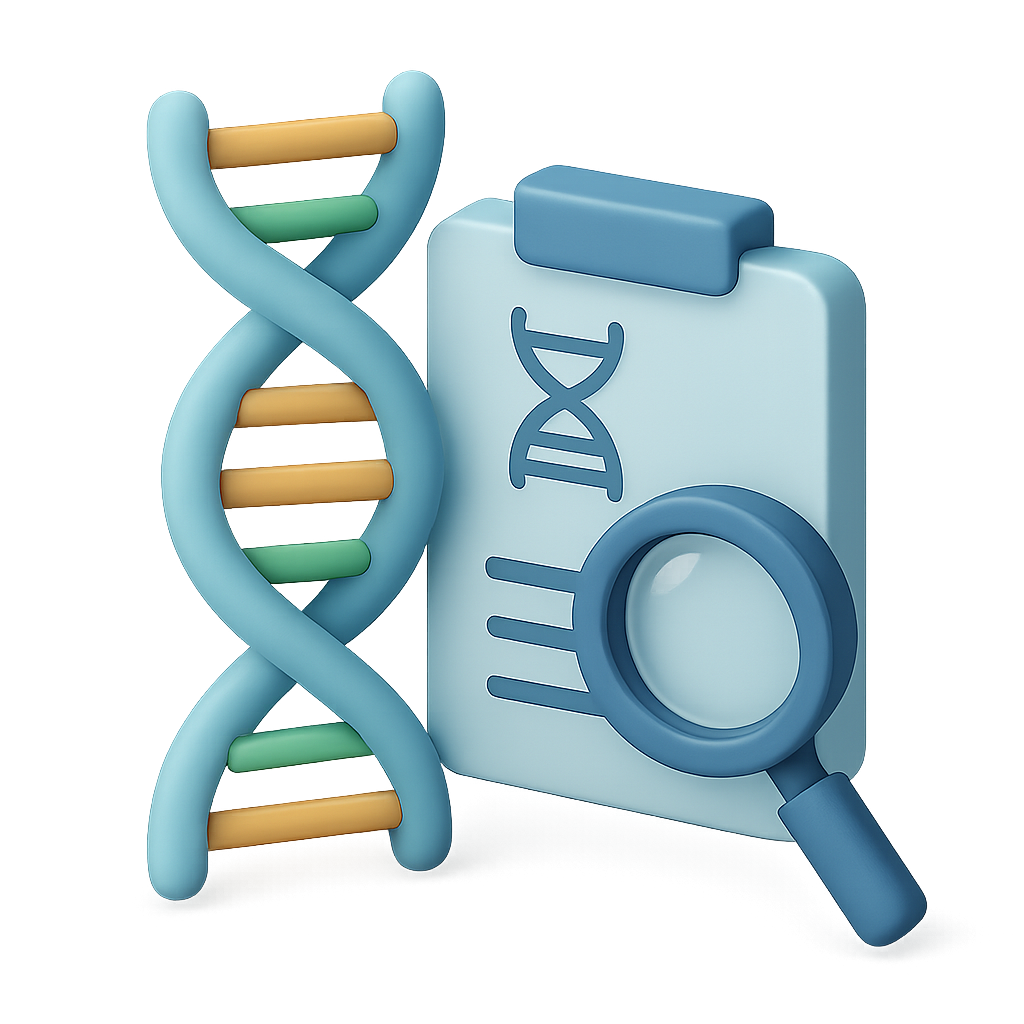 /Collection: /by davooda/Type: PNG/A visually appealing 3D icon depicting a DNA double helix alongside a clipboard featuring a DNA symbol and a magnifying glass. The design is simple yet effective, showcasing a transparent background with a three-quarter isometric view.