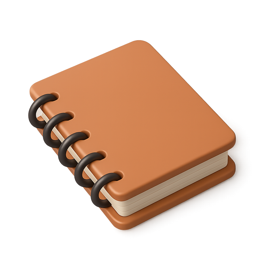 /Collection: /by davooda/Type: PNG/A stylized 3D icon of a spiral notebook, featuring an orange cover and black rings, presented in a three-quarter isometric view on a softly illuminated background.